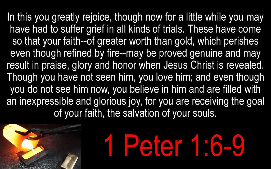 1Peter 1:6 – 9 “In this you greatly rejoice, though now for a little while you may have had to suffer grief in various trials so that the proven character of your faith—more precious than gold, which perishes even though refined by fire—may result in praise, glory, and honor at the revelation of Jesus Christ. Though you have not seen Him, you love Him; and though you do not see Him now, you believe in Him and rejoice with an inexpressible and glorious joy, now that you are receiving the goal of your faith, the salvation of your souls.”