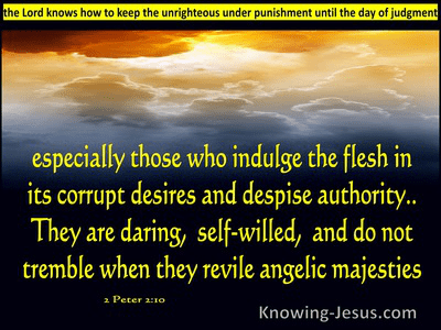 2 Peter 2:10 – 13 “Such punishment is specially reserved for those who indulge the corrupt desires of the flesh and despise authority. Bold and self-willed, these men are unafraid to slander angelic majesties. Yet not even angels, though greater in strength and power, dare to bring such slanderous charges against them before the Lord.