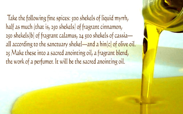 As indicated by the recipe quoted in the photo, this oil had a distinct and unusual scent. The oil was to be applied to indicate that everything and everyone it touched was holy. More than that, the very scent of the oil would permeate all the items, all the clothing, and even remain on the bodies of the priests. Anyone smelling that scent would understand that they were in the presence of something holy and dedicated to the Lord.