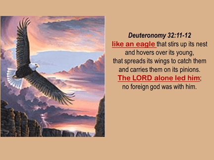 “As an eagle stirs up its nest and hovers over its young, He spread His wings to catch them; He carried them on His pinions.” Baby eagles are enjoying the security of the nest when one day, Mama Eagle suddenly begins tearing the nest apart. Once the nest is gone, the baby eagles have no choice but to launch out; however, they aren’t very good at flying and tend to drop out one by one. Mama Eagle will swoop under a baby eagle, catching it on her wings and then dumping the baby eagle off again. This process is repeated until the baby eagle suddenly gets the idea and begins flying on its own. The Israelites had settled in Egypt, and God had to stir things up to get them to leave. But God also provided for the Israelites throughout their wanderings in the wilderness.
