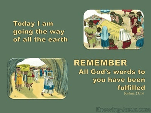 “Now I am about to go the way of all the earth. You know with all your heart and soul that not one of all the good promises the Lord your God gave you has failed. Every promise has been fulfilled; not one has failed. But just as all the good things the Lord your God has promised you have come to you, so he will bring on you all the evil things he has threatened, until the Lord your God has destroyed you from this good land he has given you. If you violate the covenant of the Lord your God, which he commanded you, and go and serve other gods and bow down to them, the Lord’s anger will burn against you, and you will quickly perish from the good land he has given you.”