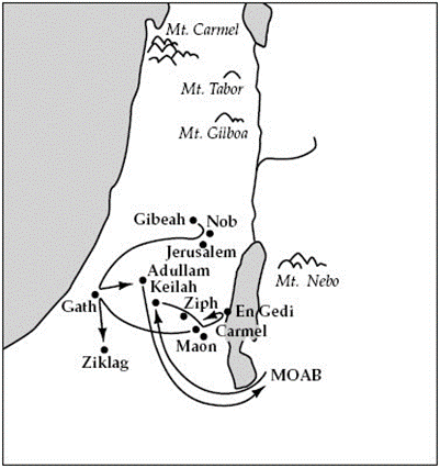 From there David went to Mizpeh of Moab, where he said to the king of Moab, “Please let my father and mother stay with you until I learn what God will do for me.” So, he left them in the care of the king of Moab, and they stayed with him the whole time David was in the stronghold. Then the prophet Gad said to David, “Do not stay in the stronghold. Depart and go into the land of Judah.” So David left and went to the forest of Hereth.