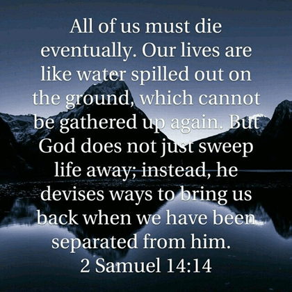 The woman asked, “Why have you devised a thing like this against the people of God? When the king says this, does he not convict himself, since he has not brought back his own banished son? For surely, we will die and be like water poured out on the ground, which cannot be recovered. Yet God does not take away a life; but He devises ways that the banished one may not be cast out from Him.