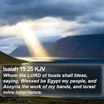 And the LORD will strike Egypt with a plague; He will strike them but heal them. They will turn to the LORD, and He will hear their prayers and heal them. In that day there will be a highway from Egypt to Assyria. The Assyrians will go to Egypt, and the Egyptians to Assyria. The Egyptians and Assyrians will worship together. In that day Israel will join a three-party alliance with Egypt and Assyria—a blessing upon the earth. The LORD of Hosts will bless them, saying, “Blessed be Egypt My people, Assyria My handiwork, and Israel My inheritance.”