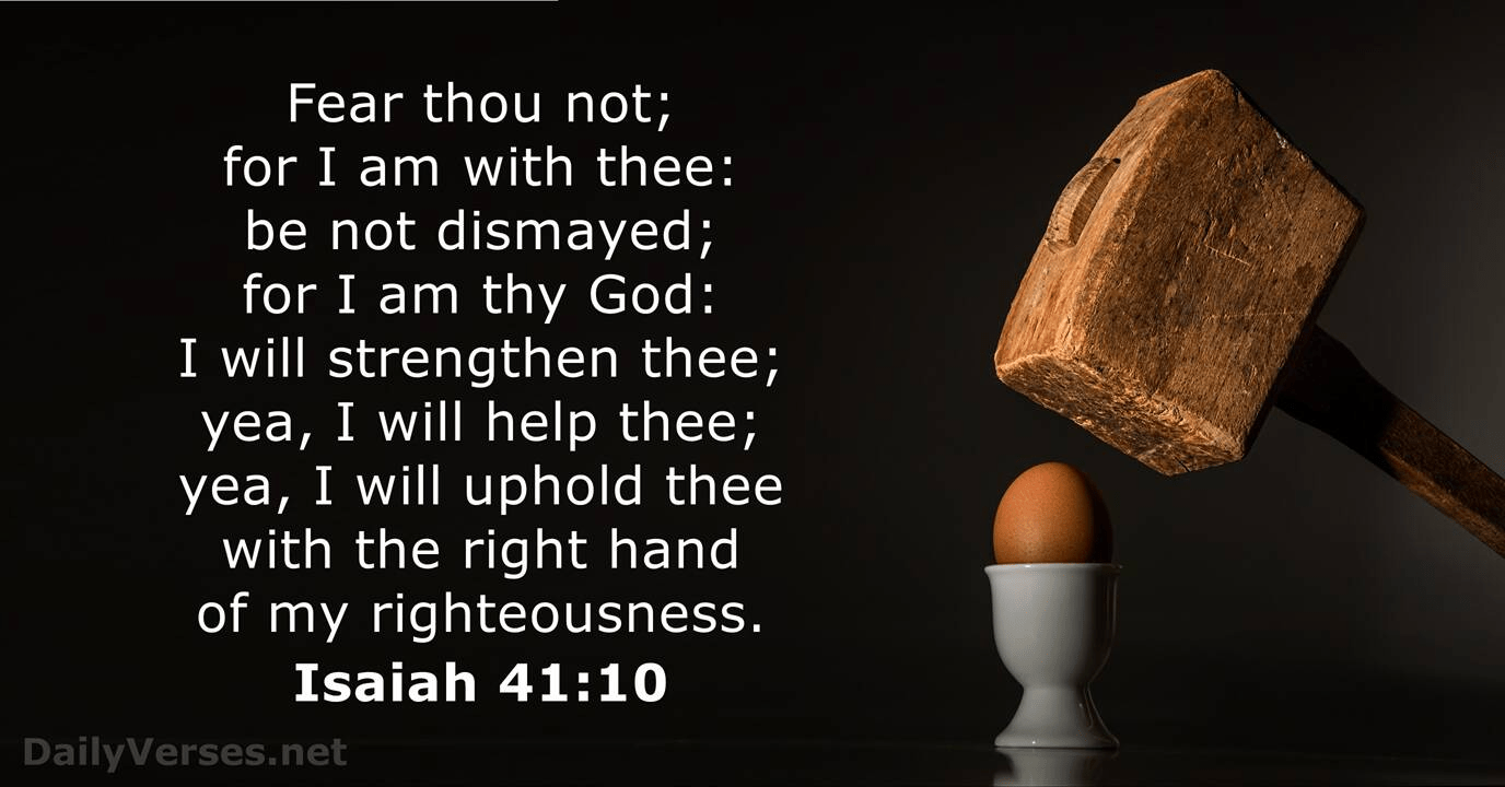 “But you, O Israel, My servant, Jacob, whom I have chosen, descendant of Abraham My friend—I brought you from the ends of the earth and called you from its farthest corners. I said, ‘You are My servant.’ I have chosen and not rejected you. Do not fear, for I am with you; do not be afraid, for I am your God. I will strengthen you; I will surely help you; I will uphold you with My right hand of righteousness. Behold, all who rage against you will be ashamed and disgraced; those who contend with you will be reduced to nothing and will perish. You will seek them but will not find them. Those who wage war against you will come to nothing. For I am the LORD your God, who takes hold of your right hand and tells you: Do not fear, I will help you.