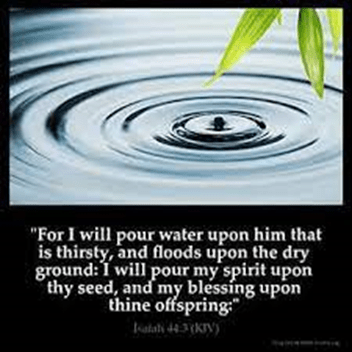 “This is the word of the LORD, your Maker, who formed you from the womb and who will help you: “Do not be afraid, O Jacob My servant, Jeshurun, (Jeshurun means the upright one, a term of endearment for Israel.) whom I have chosen. For I will pour water on the thirsty land, and currents on the dry ground. I will pour out My Spirit on your descendants, and My blessing on your offspring.” Once more, God is promising to restore Israel and to recall the Israelites to worship only Him.