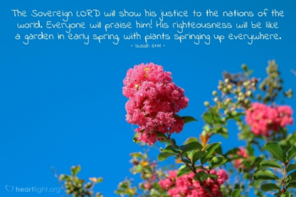 I will rejoice greatly in the LORD, my soul will exult in my God; for He has clothed me with garments of salvation and wrapped me in a robe of righteousness, as a groom wears a priestly headdress, and as a bride adorns herself with her jewels. For as the earth brings forth its growth, and as a garden enables seed to spring up, so the Lord GOD will cause righteousness and praise to spring up before all the nations.”