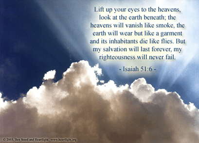 Lift up your eyes to the heavens, and look at the earth below; for the heavens will vanish like smoke, the earth will wear out like a garment, and its people will die like gnats. But My salvation will last forever, and My righteousness will never fail.