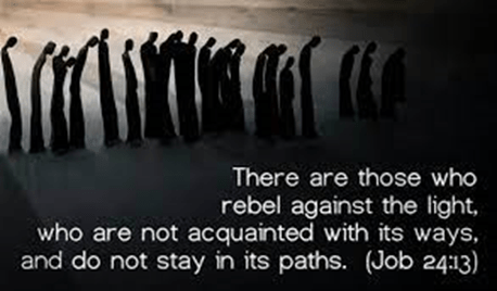 Then there are those who rebel against the light, not knowing its ways or staying on its paths. When daylight is gone, the murderer rises to kill the poor and needy; in the night he is like a thief. The eye of the adulterer watches for twilight. Thinking, ‘No eye will see me,’ he covers his face. In the dark they dig through houses; by day they shut themselves in, never to experience the light. For to them, deep darkness is their morning; surely they are friends with the terrors of darkness! They are but foam on the surface of the water; their portion of the land is cursed, so that no one turns toward their vineyards.