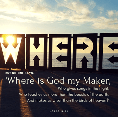 “People cry out under a load of oppression; they plead for relief from the arm of the powerful. But no one says, ‘Where is God my Maker, who gives songs in the night, who teaches us more than he teaches the beasts of the earth and makes us wiser than the birds in the sky?’