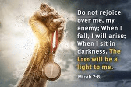 Do not rejoice over me, my enemy; when I fall, I will arise; when I sit in darkness, the Lord will be a light to me. I will bear the indignation of the Lord, because I have sinned against Him, until He pleads my case and executes justice for me. He will bring me forth to the light; I will see His righteousness. Then she who is my enemy will see, and shame will cover her who said to me, “Where is the Lord your God?” My eyes will see her; now she will be trampled down like mud in the streets.