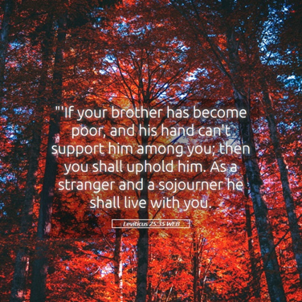 Lending to the Poor “‘If one of your brethren becomes poor, and falls into poverty among you, then you shall help him, like a stranger or a sojourner, that he may live with you. Take no usury or interest from him; but fear your God, that your brother may live with you. You shall not lend him your money for usury, nor lend him your food at a profit. I am the Lord your God, who brought you out of the land of Egypt, to give you the land of Canaan and to be your God.