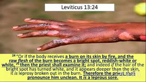 “Or if the body receives a burn on its skin by fire, and the raw flesh of the burn becomes a bright spot, reddish-white or white, then the priest shall examine it; and indeed if the hair of the bright spot has turned white, and it appears deeper than the skin, it is leprosy broken out in the burn. Therefore the priest shall pronounce him unclean. It is a leprous sore. But if the priest examines it, and indeed there are no white hairs in the bright spot, and it is not deeper than the skin, but has faded, then the priest shall isolate him seven days. And the priest shall examine him on the seventh day. If it has at all spread over the skin, then the priest shall pronounce him unclean. It is a leprous sore. But if the bright spot stays in one place, and has not spread on the skin, but has faded, it is a swelling from the burn. The priest shall pronounce him clean, for it is the scar from the burn.