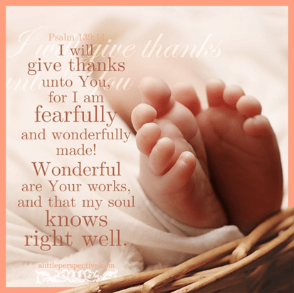 For You formed my inmost being; You knit me together in my mother’s womb. I praise You, for I am fearfully and wonderfully made. Marvelous are Your works, and I know this very well. My frame was not hidden from You when I was made in secret, when I was woven together in the depths of the earth.