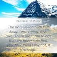 ”The leech has two daughters: Give and Give. There are three things that are never satisfied, four that never say, ‘Enough!’: Sheol, the barren womb, land never satisfied with water, and fire that never says, ‘Enough!’