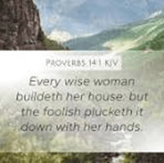 APPLICATION: Reading the first verse of this chapter, we might well ask, “Why pick on women? Men can destroy a family just as quickly!” While that statement is true, women are the ones who have traditionally been home makers. This is not to ignore those men who as single parents have successfully created safe homes for their children. Those men deserve extra crowns in glory! Being a home maker involves far more than doing the cooking and sweeping, washing dishes and clothes, and tending children.