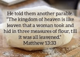 Matthew 13:33 “Another parable He spoke to them: “The kingdom of heaven is like leaven, which a woman took and hid in three measures of meal till it was all leavened.”