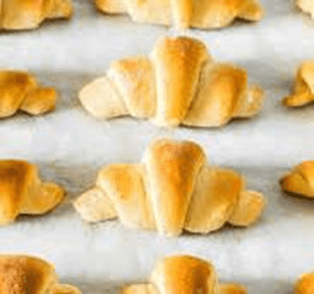 Turn out onto lightly floured surface. Divide dough in thirds and Roll each third into a 9-inch circle. Brush with melted butter. Cut each circle in 12 wedge-shaped pieces. Roll each wedge up (wide end to point)