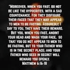 Matthew 6:16 “Moreover, when you fast, do not be like the hypocrites, with a sad countenance. For they disfigure their faces that they may appear to men to be fasting. Assuredly, I say to you, they have their reward. But you, when you fast, anoint your head and wash your face, so that you do not appear to men to be fasting, but to your Father who is in the secret place; and your Father who sees in secret will reward you openly.“