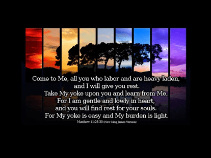 Come to Me, all you who labor and are heavy laden, and I will give you rest. Take My yoke upon you and learn from Me, for I am gentle and lowly in heart, and you will find rest for your souls. For My yoke is easy and My burden is light.”