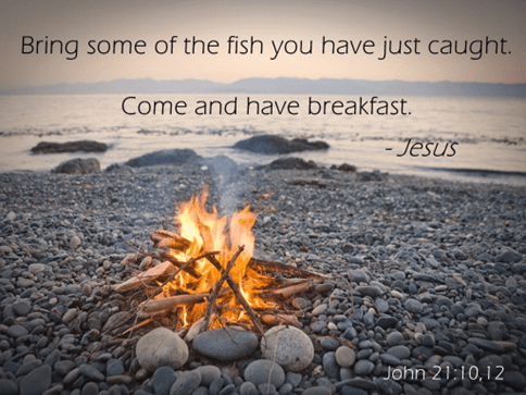 Although John is writing this Gospel, he routinely refers to himself as “the disciple whom Jesus loved.” Now the penny drops for John and he cries out, “It’s the Lord!” Suddenly, Peter remembers the first time he has seen a similar miracle-the day Jesus borrowed his boat as a makeshift pulpit and then ordered him to go fishing in the middle of the day. Peter immediately wraps his outer garment around him, hops out of the boat, and splashes to the shore to greet Jesus. Meanwhile, the other disciples also hop out of the boat and drag the bulging net and the boat full of fish to shore because the water is very shallow. Jesus grills some of the fish and feeds the disciples with fish and bread.