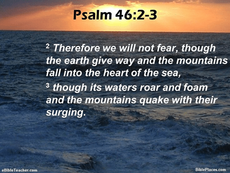 Psalm 46:2-3 “Therefore we will not fear, though the earth is transformed and the mountains are toppled into the depths of the seas, though their waters roar and foam and the mountains quake in the surge. Selah”