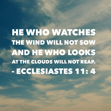 He who observes the wind will not sow, and he who regards the clouds will not reap.” I grew up on an Illinois farm at a time when much of the work was done by hand. We were still caring for beef cattle, pigs, and chickens, and milking cows by hand. Our work had to go on no matter how bad the weather was. If an ancient farmer demanded a sunny day with no wind before he would sow crops, he would never reap a harvest, for such days are rare. You must determine God’s calling on your life and then do your best to fulfill it without waiting for conditions to become perfect. If you demand perfect conditions, you will waste your entire life.