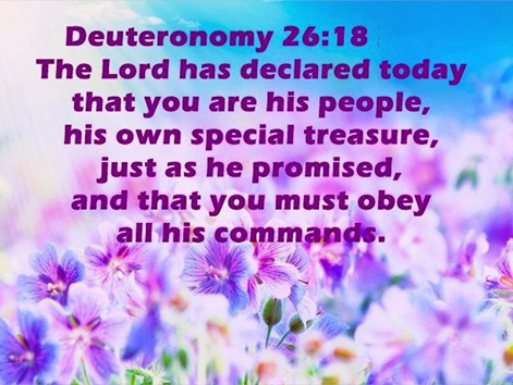 18-19 And today God has reaffirmed that you are dearly held treasure just as he promised, a people entrusted with keeping his commandments, a people set high above all other nations that he’s made, high in praise, fame, and honor: you’re a people holy to God, your God. That’s what he has promised.”