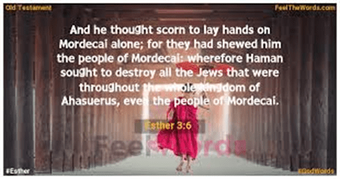 APPLICATION: Consulting Wikipedia, it appears that Haman’s threats were the first organized attempts at genocide for the Jews. While earlier invaders had destroyed the temple in Jerusalem and had killed or carried off much of the population of Judah and Israel, these actions were those of “normal” invasion and not specifically antisemitic. (https://en.wikipedia.org/wiki/Timeline_of_antisemitism) Unfortunately, as this excellent article points out, throughout the centuries there have been repeated attempts of various kinds to wipe out God’s chosen people-massacres, seizure of property, expulsion from various countries, isolation in ghettoes, etc. Many of the other races that were included in the ancient Persian Empire have since vanished; however, despite all this persecution, the Jews remain and the State of Israel continues to flourish.
