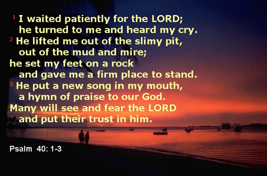 Psalm 40:1-4 I waited patiently for God to help me; then he listened and heard my cry. He lifted me out of the pit of despair, out from the bog and the mire, and set my feet on a hard, firm path, and steadied me as I walked along. He has given me a new song to sing, of praises to our God. Now many will hear of the glorious things he did for me, and stand in awe before the Lord, and put their trust in him. Many blessings are given to those who trust the Lord and have no confidence in those who are proud or who trust in idols.